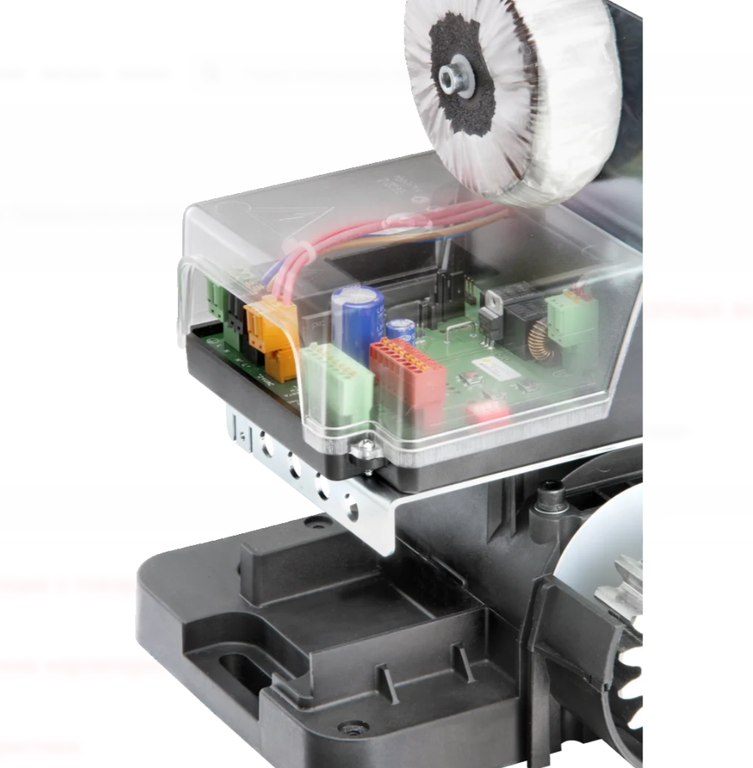 Привод поставляется в комплекте со стальной зубчатой рейкой с пластиковым покрытием (5 метров), монтажным основанием и одним 4-х каналным радиопередатчиком (пультом ДУ Арт. 4018). В качестве дополнительного оборудования доступны фотоэлементы и сигнальная лампа.